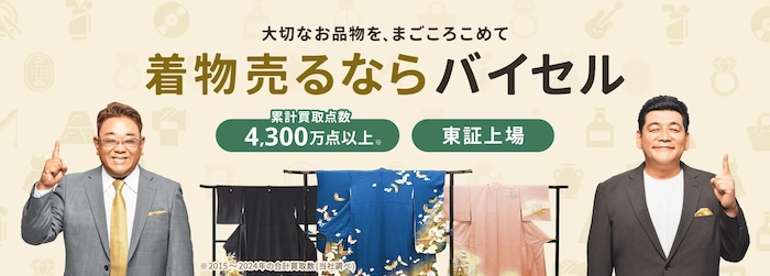 2位![]() バイセル | すぐに出張買取に来てくれる! ・東証マザーズ上場企業 ・電話申込が24時間365日可能 ・着物を含む買取実績3700万点 ・どのような状態の着物でも相談OK バイセルの公式サイトはこちら ▶︎バイセル着物買取の口コミまとめ |