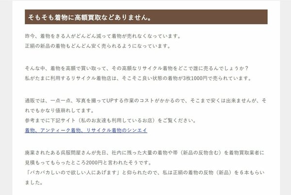 以前から押し買いによる被害は後を絶たず、多くの人に注意喚起をしたいと考えた結果「着物の高額買取なんてありません」という非常にインパクトがある文言を打ち出したと考えられます。