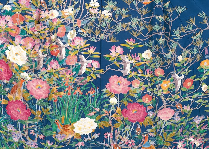 - 脇や背中の縫い目を問わず、着物全体に柄が一枚の絵のように繋がっている
